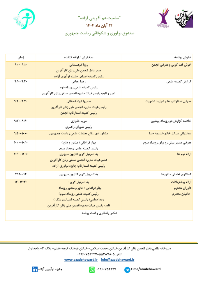 برنامه: مرور مسیر شرکت‌کنندگان پیشین جایزه، گفت‌وگوی آزاد درباره تجربه‌های نوآوری و بازتعریف همکاری‌ها در اکوسیستم فناوری زنان